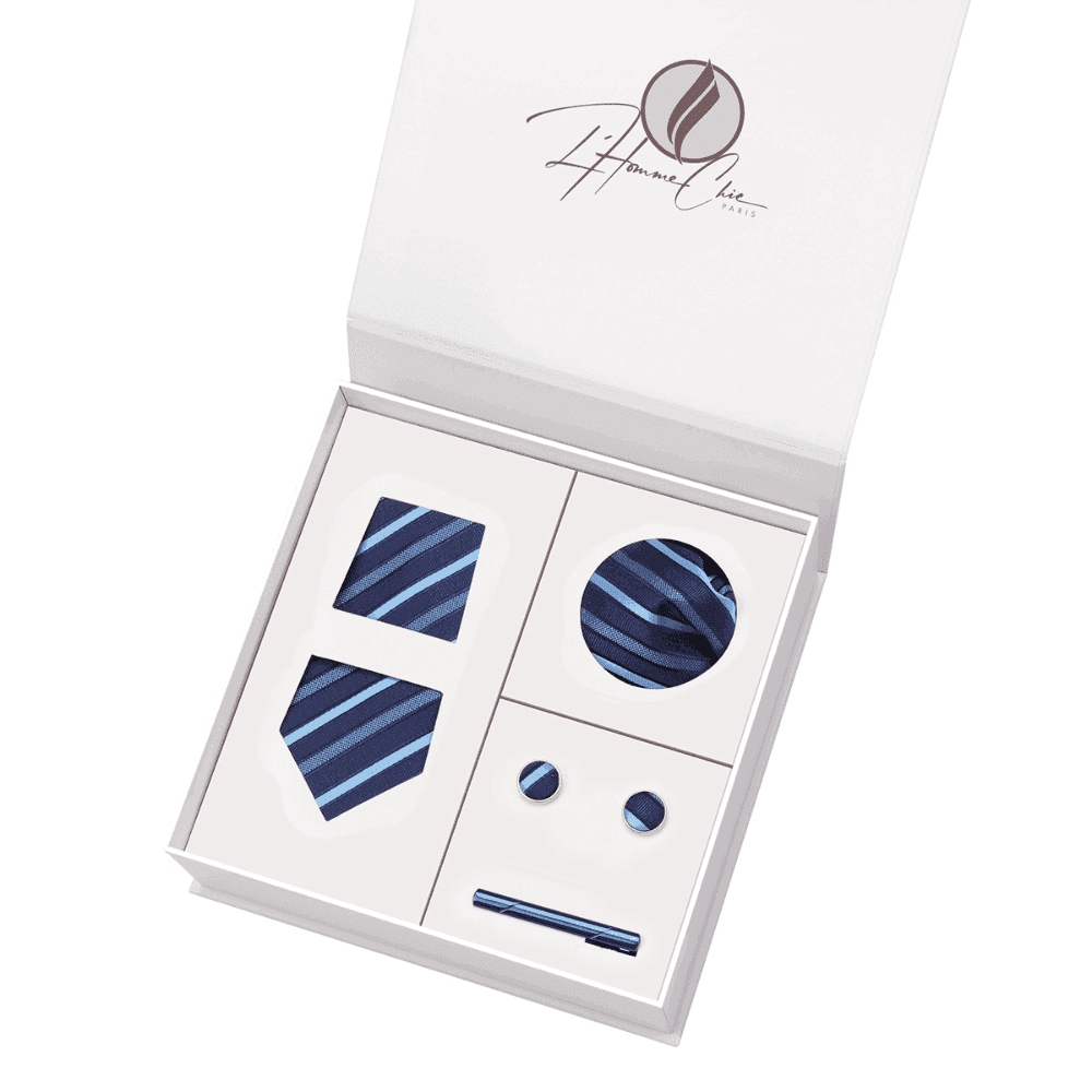 Faites l’expérience d’un style raffiné et d’une élégance intemporelle avec ce set de cravate assortie signé L’Homme Chic Paris. Inspiré par la tradition des accessoires de mode masculine, cet ensemble a été pensé pour l’homme moderne en quête de simplicité et de distinction. Composé d’une cravate, d’une pochette de costume, de boutons de manchette et d’une épingle à cravate, ce set complet vous permet de gagner du temps tout en maîtrisant chaque détail de votre tenue.