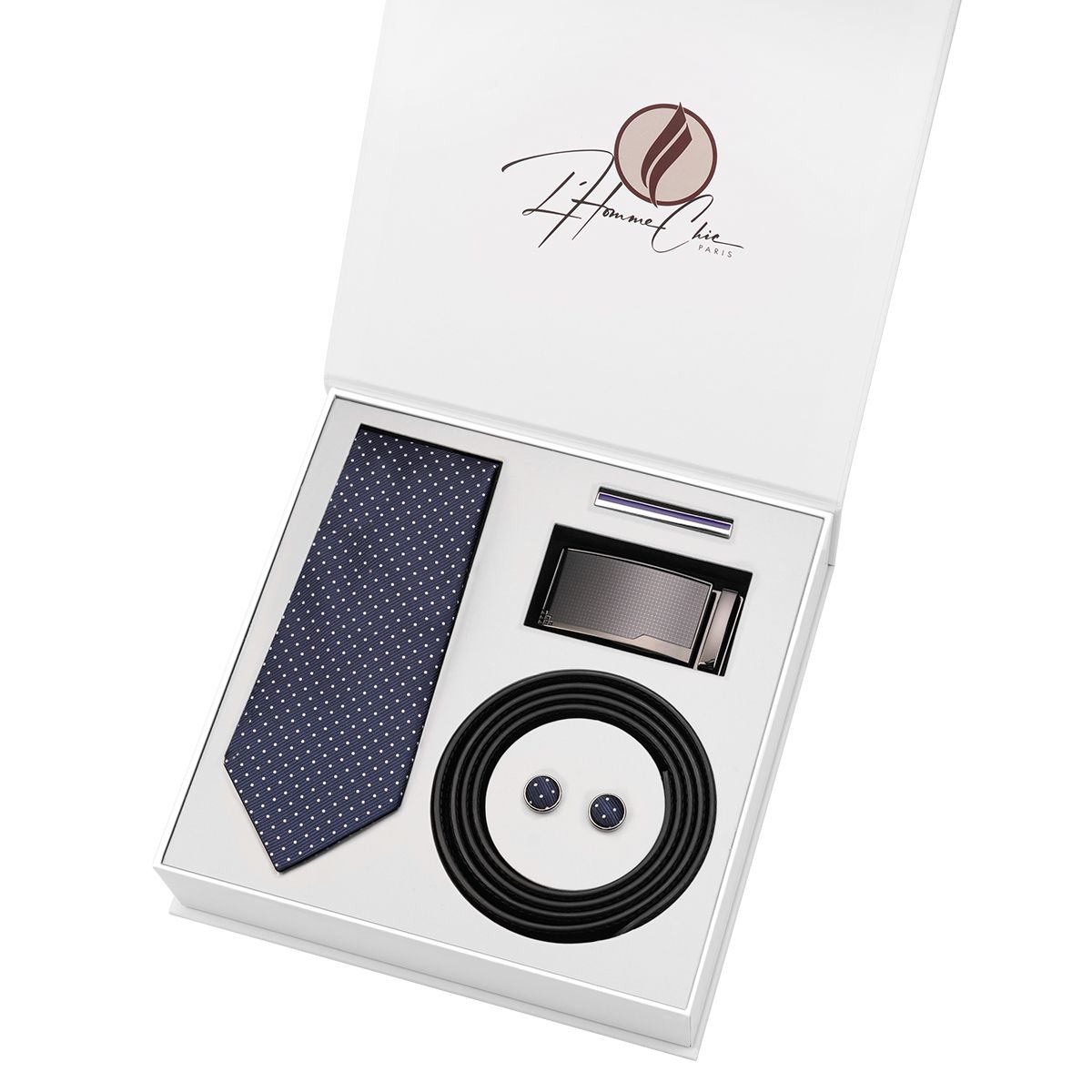 | Inclus dans le set | Boutons de manchette, Ceinture en cuir avec boucle amovible, Cravate, Épingle à cravate |