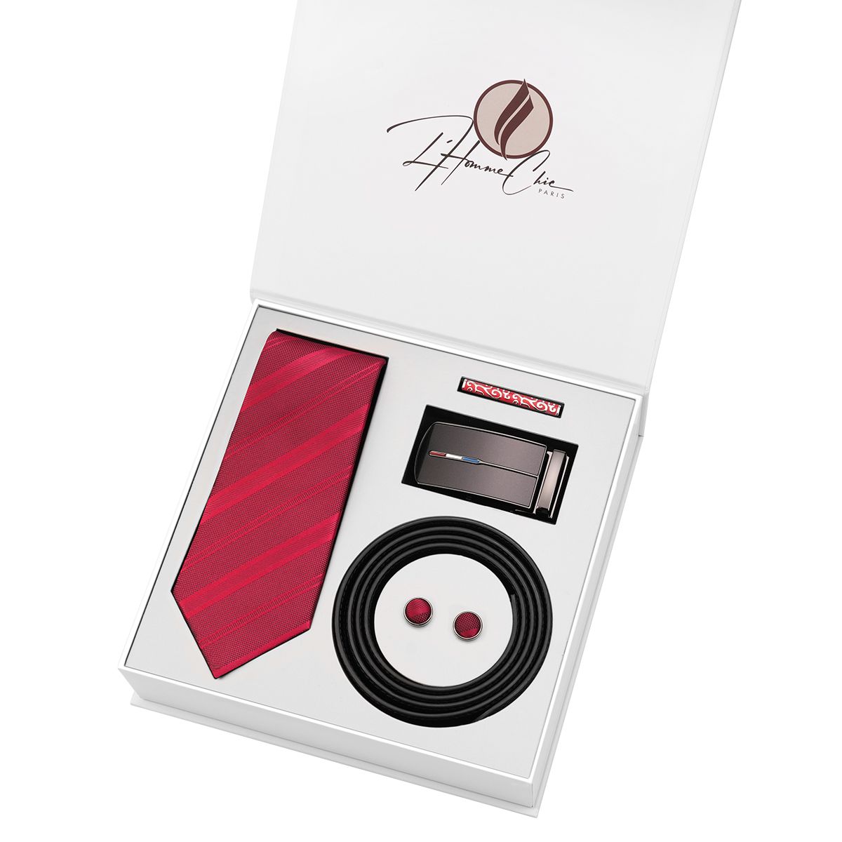 Set Cravate Bordeau à Rayure et Ceinture Noir