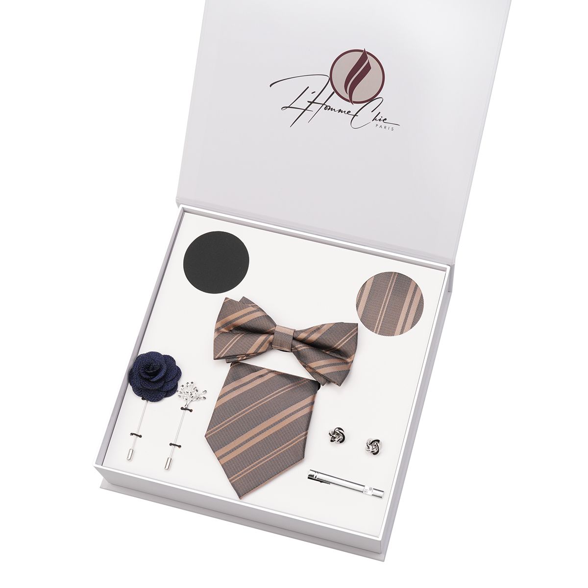Découvrez un set d’accessoires polyvalent et raffiné avec le set cravate composée de L’Homme Chic Paris. Conçu pour ceux qui recherchent à la fois la distinction et la diversité, cet ensemble complet inclut une cravate, un nœud papillon, deux pochettes de costume, des boutons de manchette, une broche et une épingle à cravate. Fabriqué en soie 100% pure, chaque pièce de ce set est assortie et travaillée à la main, reflétant un savoir-faire d’exception et un style intemporel.