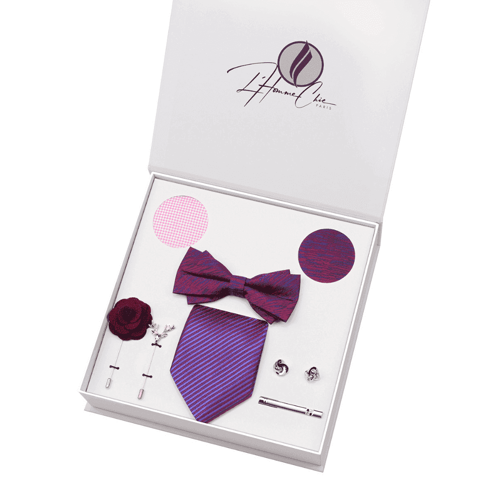 | Inclus dans le set | Boutons de manchette, Broche, Cravate, Deux pochettes, Épingle à cravate assortis, Nœud papillon |