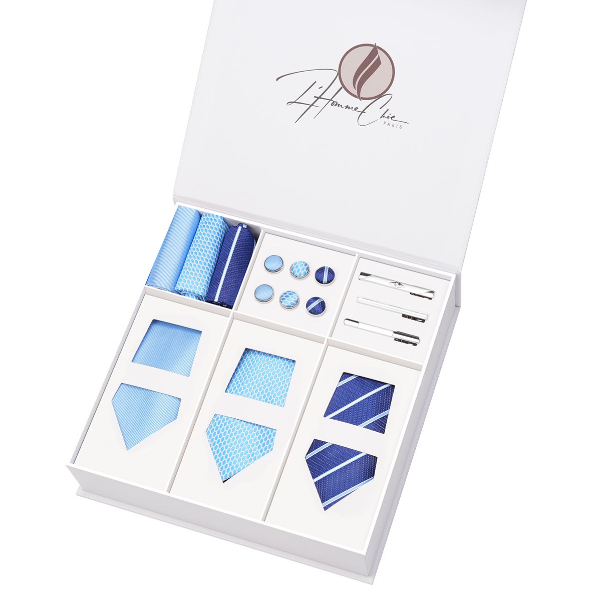 | Inclus dans le set | Trois cravates, Trois épingles à cravate assortis, Trois paires de boutons de manchette, Trois pochettes |