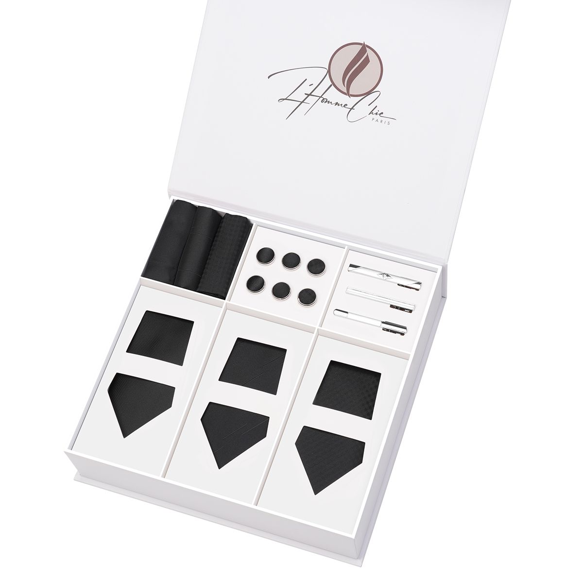 Optez pour la polyvalence avec ce set de cravates en lot signé L’Homme Chic Paris, idéal pour varier vos styles avec élégance. Ce set complet se compose de trois cravates, de trois pochettes assorties, de trois paires de boutons de manchette et de trois épingles à cravate, permettant de multiples combinaisons harmonieuses.