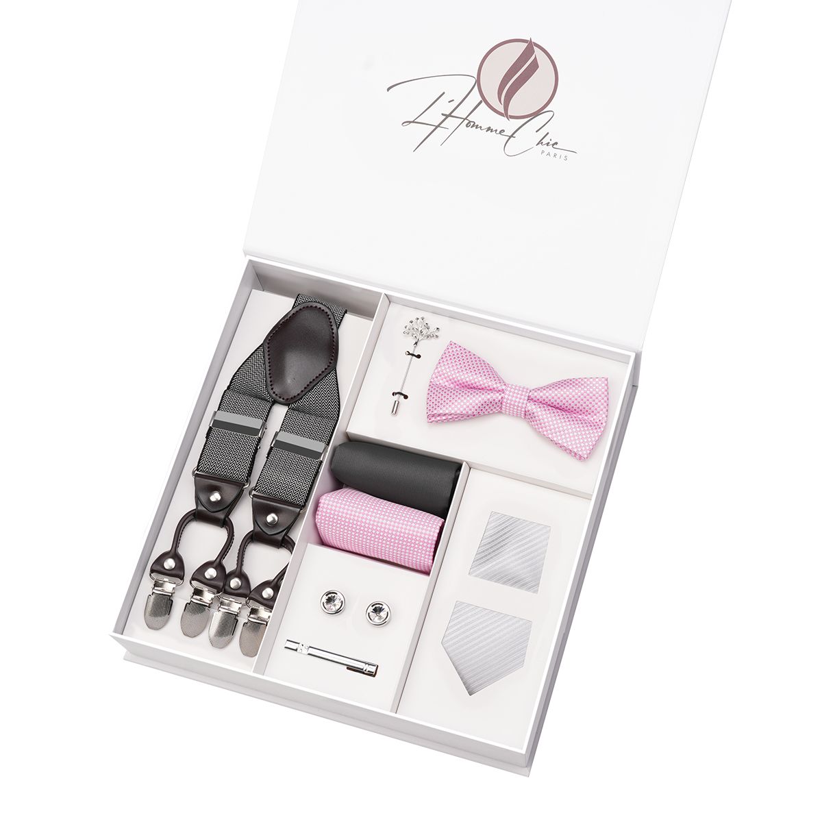 Optez pour un ensemble d’accessoires d’exception avec ce set bretelles composées de L’Homme Chic Paris. Idéal pour les hommes en quête d’un style élégant et harmonieux, ce set comprend des bretelles assorties, une cravate, un nœud papillon, une pochette, des boutons de manchette, une épingle à cravate et une broche. Confectionné en soie 100% naturelle (à l’exception des bretelles), chaque pièce est soigneusement assortie pour offrir une élégance intemporelle et un style maîtrisé.