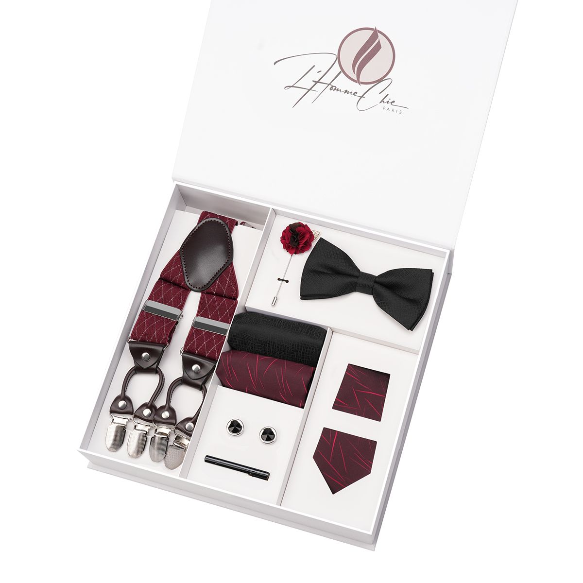 Optez pour un ensemble d’accessoires d’exception avec ce set bretelles composées de L’Homme Chic Paris. Idéal pour les hommes en quête d’un style élégant et harmonieux, ce set comprend des bretelles assorties, une cravate, un nœud papillon, une pochette, des boutons de manchette, une épingle à cravate et une broche. Confectionné en soie 100% naturelle (à l’exception des bretelles), chaque pièce est soigneusement assortie pour offrir une élégance intemporelle et un style maîtrisé.