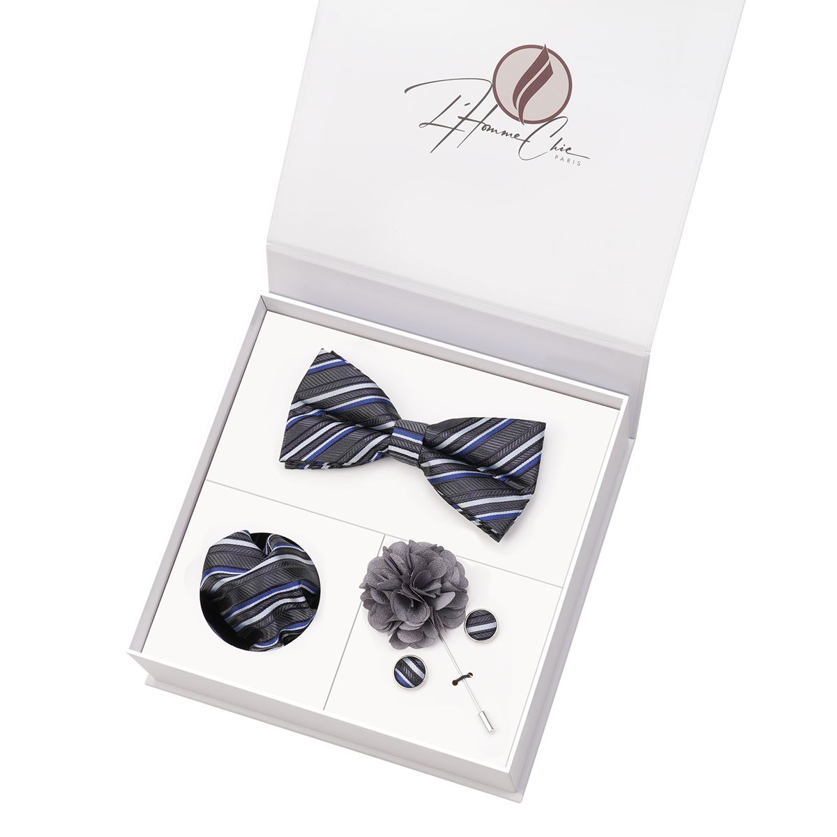 Set Noeud Papillon Assorti Gris à Rayure Bleue