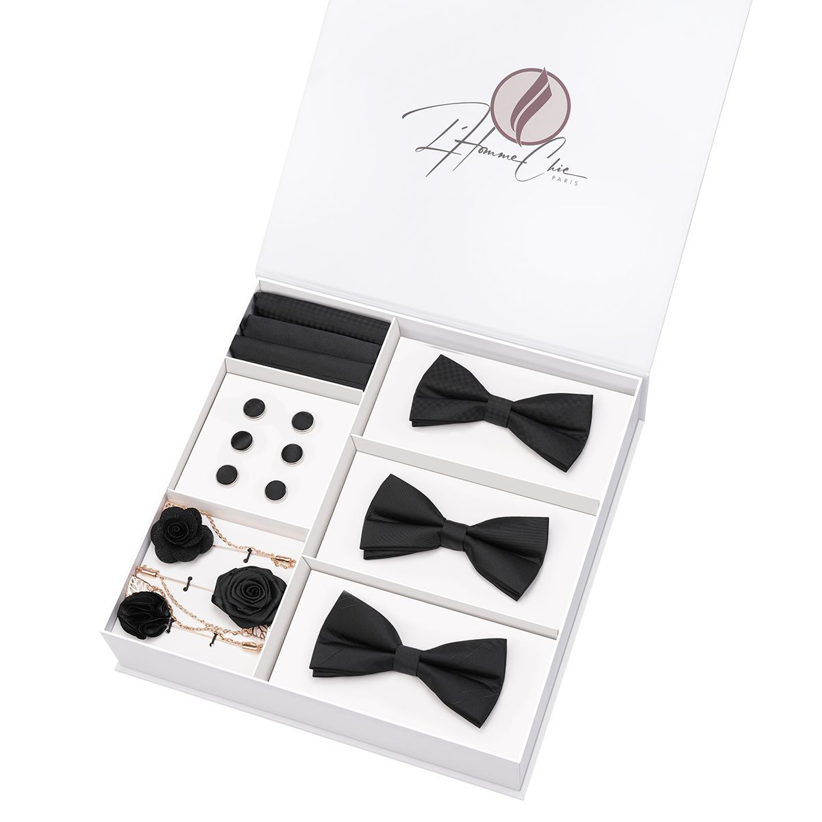 | Inclus dans le set | Trois broches assorties, Trois nœuds papillon, Trois paires de boutons de manchette, Trois pochettes |