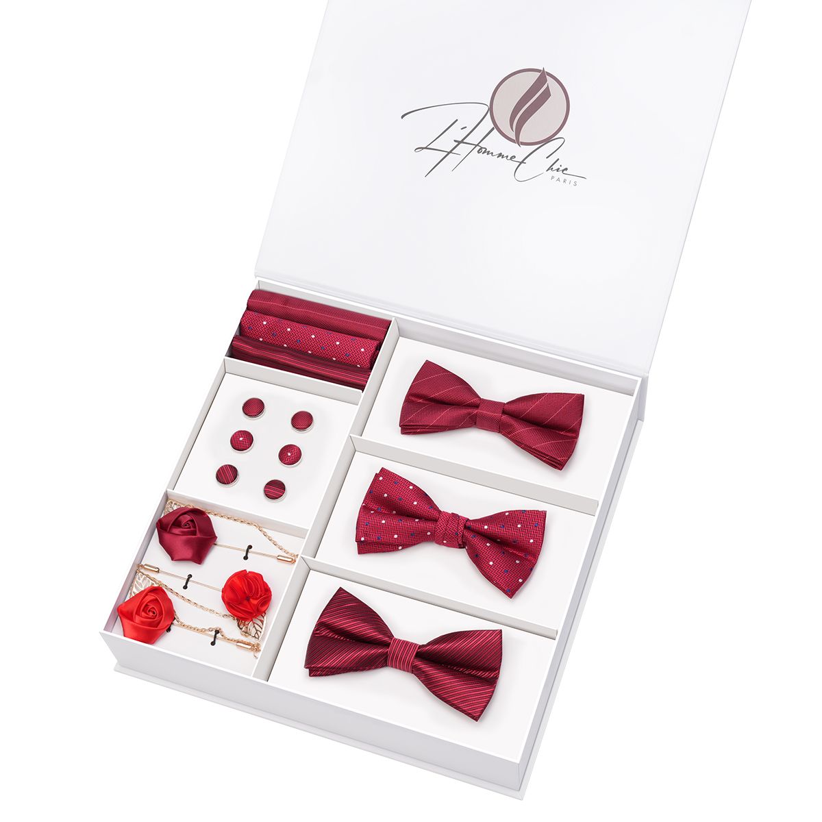 | Inclus dans le set | Trois broches assorties, Trois nœuds papillon, Trois paires de boutons de manchette, Trois pochettes |