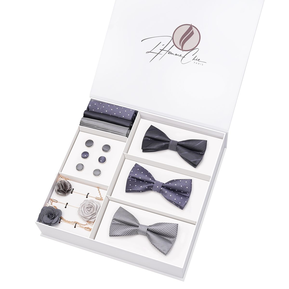 Ajoutez de la diversité à votre garde-robe avec ce set de nœuds papillon en lot signé L’Homme Chic Paris. Parfait pour les hommes soucieux d’un style raffiné et intemporel, ce set inclut trois nœuds papillon, trois pochettes assorties, trois paires de boutons de manchette et trois broches. Confectionné en soie 100% naturelle et assemblé à la main, chaque ensemble de trois est soigneusement harmonisé pour un rendu luxueux et une élégance sans compromis.