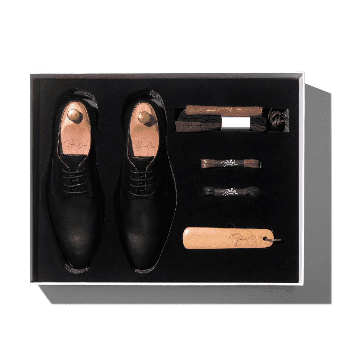 | Inclus dans le set | Chausse-pied en hêtre brut, Deux paires de chaussettes en bambou, Deux paires de lacets de rechange, Embauchoirs en cèdre rouge, Paire de chaussures |