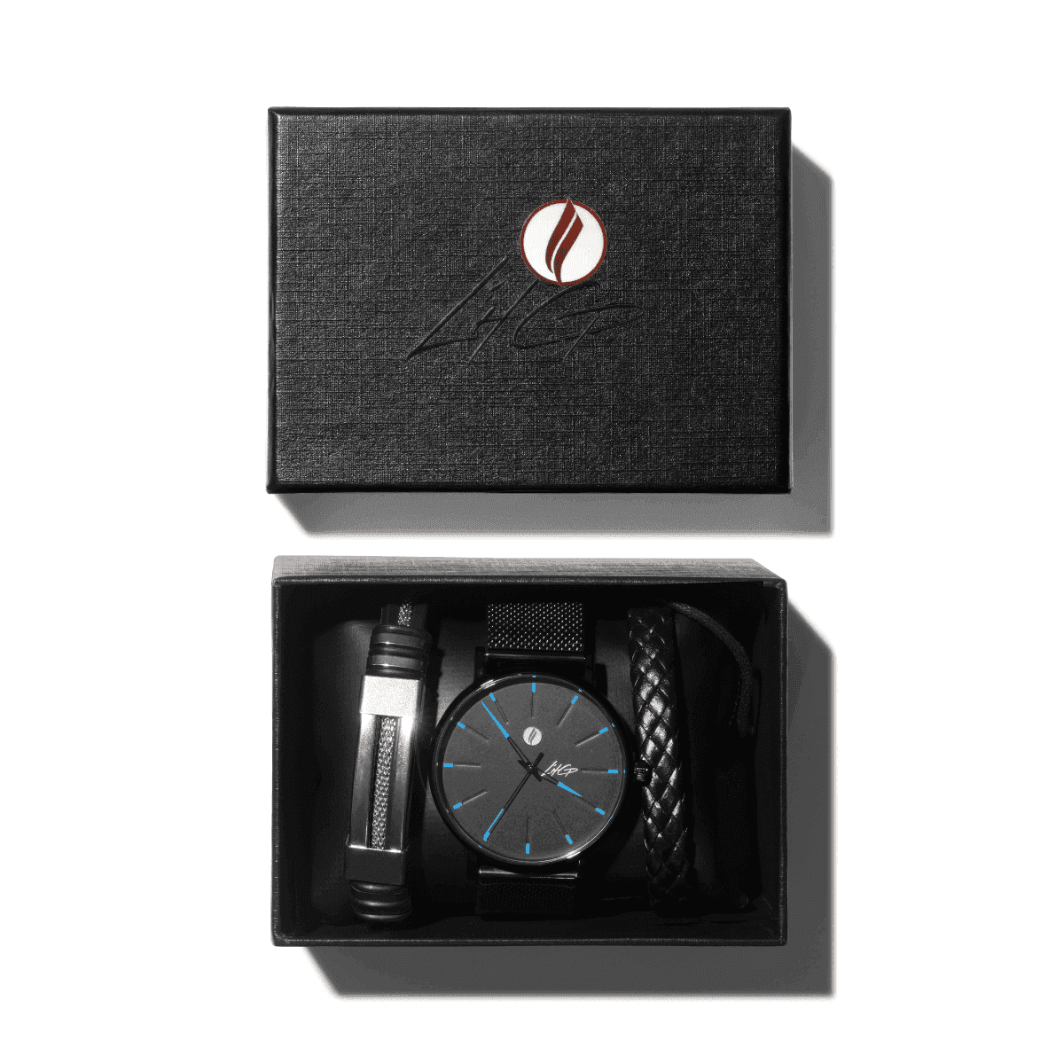 Découvrez un ensemble raffiné avec le coffret montre assortie Elégance de L’HCP, propriété de L’Homme Chic Paris. Le coffret Montre Elégance est composé d’un bracelet maille milanaise noire, cadran noir épuré avec index bleus, avec bracelets acier et